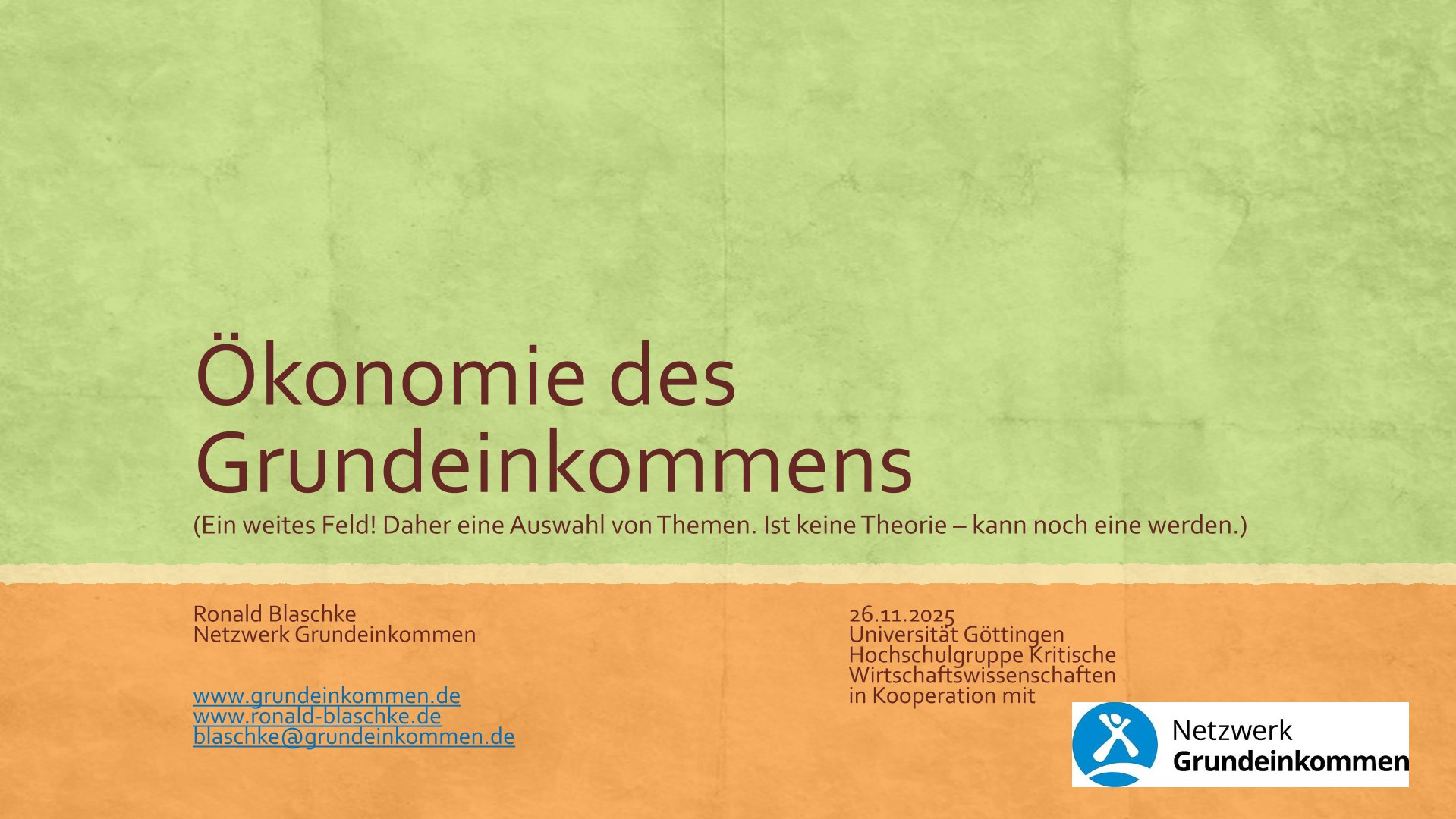Die Powerpoint zum Vortrag „Ökonomie des Grundeinkommens“ von Ronald Blaschke ist nun öffentlich zugänglich. Der Vortrag wurde am 26. November 2025 an der Universität Göttingen gehalten. Veranstalter war die Hochschulgruppe Kritische Wirtschaftswissenschaften Göttingen in Kooperation mit dem Netzwerk Grundeinkommen. jetzt lesen