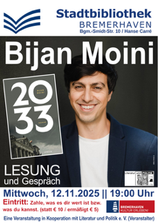 Der Verein Literatur und Politik e.V. veranstaltet in Kooperation mit der Stadtbibliothek Bremerhaven am Mittwoch, den 12. November 2025 um 19:00 Uhr in der Stadtbibliothek eine Autorenlesung mit Diskussion aus dem neuen Roman „2033“ von Bijan Moini.