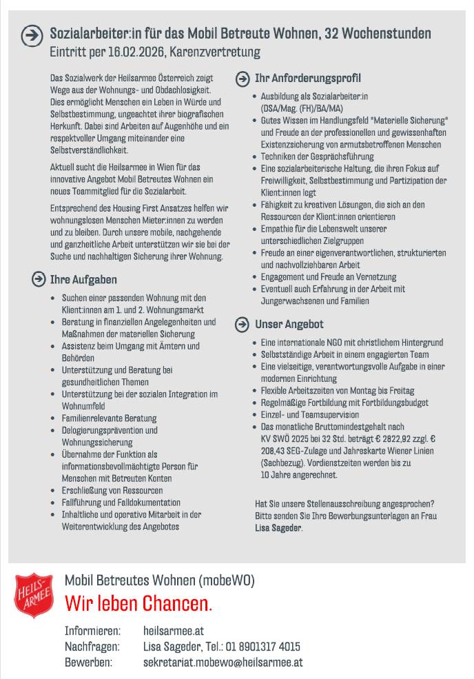 Wir bitten um Aussendung des angehängten Stelleninserates (Sozialarbeit für das Mobil Betreute Wohnen, 32 Std./Wo.).